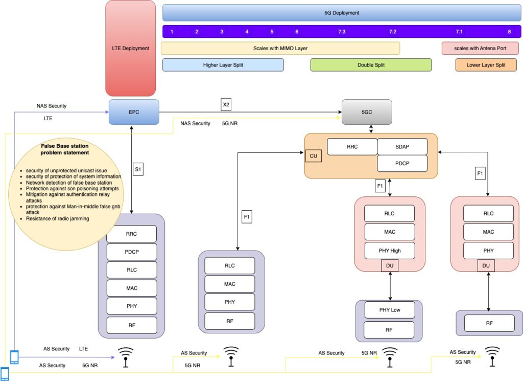 Fig 2: Functional split of 5G NR , LTE , 5G NR deployment architecture , false base station problem statement